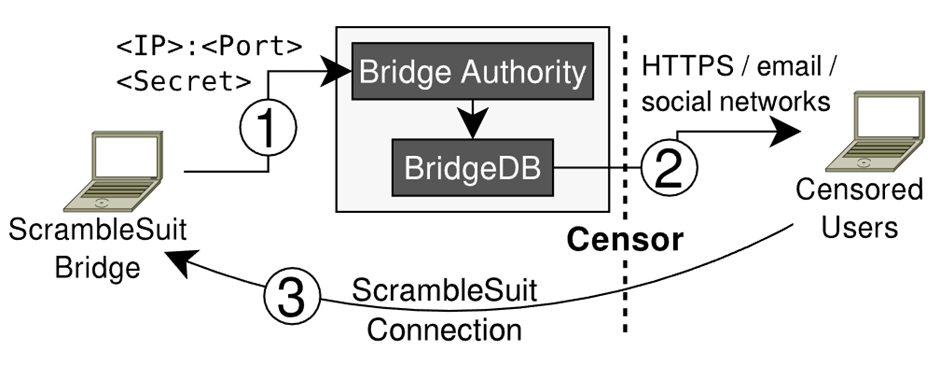 Scramblesuit represented a major step forward. Its primary improvement was probe resistance: when a Scramblesuit-capable bridge shares its identity, it includes a secret (effectively a password) that clients must possess for authentication. Any connection attempt that cannot prove possession of the secret cannot establish a Tor circuit through the bridge, thereby defeating active probers.