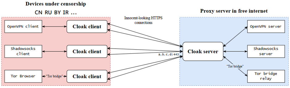 Cloak is a TLS-based pluggable transport intended to be used in conjunction with existing protocols like Shadowsocks or OpenVPN, similar to Tor’s idea of pluggable transports. It wraps the existing protocol inside a TLS channel to provide censorship resistance through TLS indistinguishability.