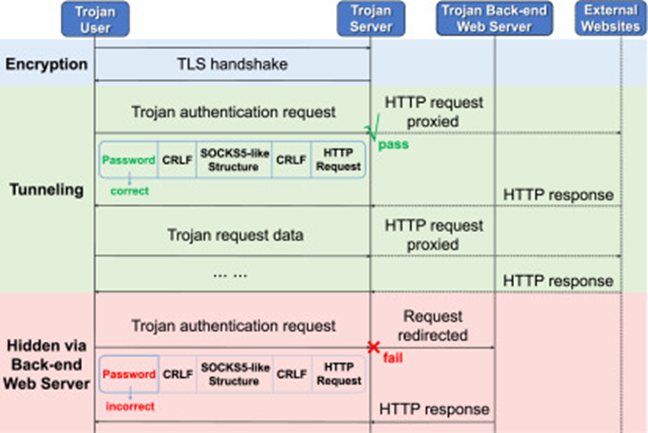 The core idea of Trojan is simple: use TLS to disguise proxied traffic as normal HTTPS.