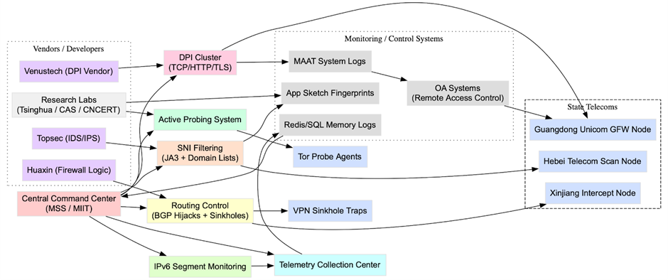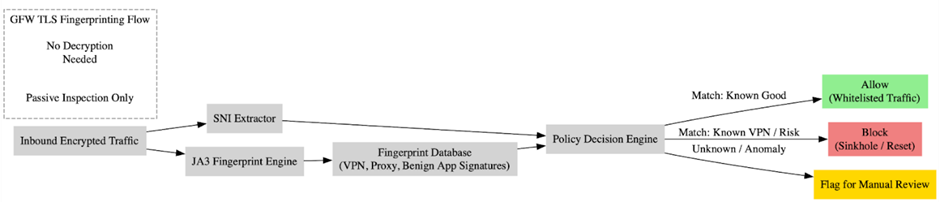 None of the above fingerprinting methods can give a reliable classification result on its own, but they become very powerful when combined. Recent leaked documents indicate that the GFW has multiple independent modules – each with different capabilities such as entropy analysis, protocol-level analysis, TLS fingerprinting, domain/SNI tagging, and behavioural study – operating either in real time or near-real time from a large pool of logs and metrics. Each module produces a score, which are then combined through lightweight ML models (or even simple linear regression) to classify connections into categories that lead to allowing, blocking, or flagging for further review and probing.