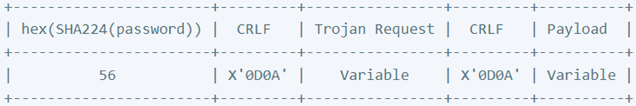 The Trojan protocol itself is very simple. Since it operates inside the TLS tunnel, there is no need for its own encryption layer. The designer also opted for minimal features, so there is no additional overhead beyond addressing. The “Trojan Request” field simply contains a SOCKS5-style destination header – address type, address, and port – and the payload follows immediately.